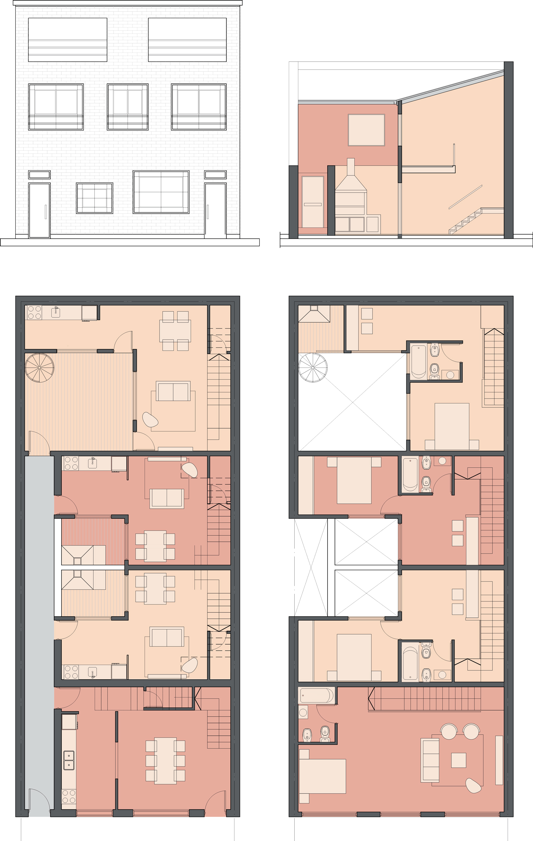 Vivienda multifamiliar, ubicada en el barrio de Palermo. Conformado por 4 PH de 2, 3 y 4 ambientes. Se lograron espacios amplios y luminosos, con cocina integrada, baƱo completo, toilette, y espaciosos patios y parrillas.